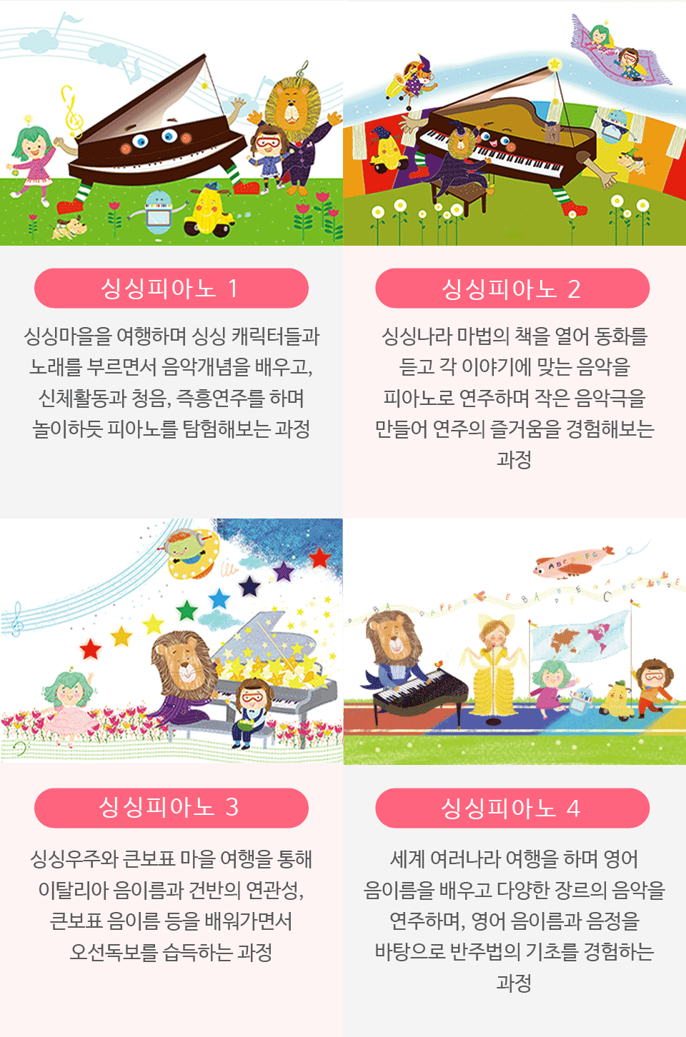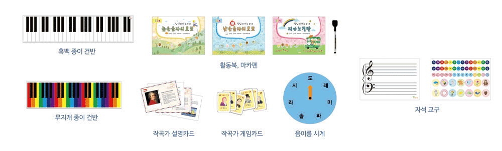 '싱싱 피아노’를 통해 유아는 건반에 대한 인지, 테크닉 ,독보방법 등을 익히며, 음악의 7요소(리듬,