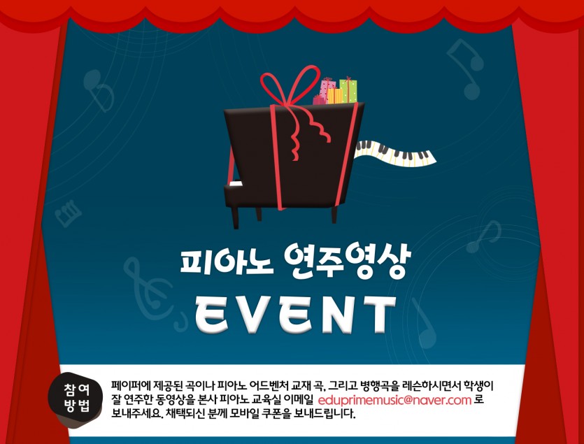 ☆참여방법: 페이퍼에 제공된 곡이나 피아노 어드벤처 교재곡, 그리고 병행곡을 레슨하시면서 학생이 잘 연주한 동영상을 본사 피아노 교육실 이메일 eduprimemusic@naver.com로 보내주세요. 메일을 보내실 때 학생사진과 간단한 회원소개도 같이 부탁드립니다.