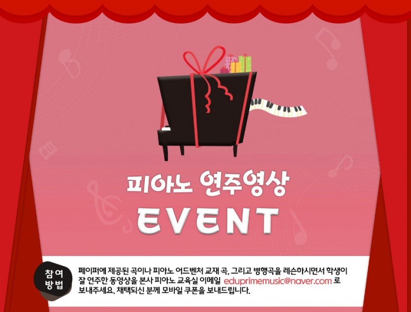☆참여방법: 페이퍼에 제공된 곡이나 피아노 어드벤처 교재곡, 그리고 병행곡을 레슨하시면서 학생이 잘 연주한 동영상을 본사 피아노 교육실 이메일 eduprimemusic@naver.com로 보내주세요. 메일을 보내실 때 학생사진과 간단한 회원소개도 같이 부탁드립니다.